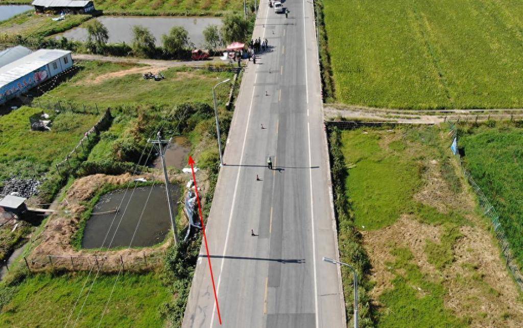 据介绍,事故现场道路平直,呈南北走向,双向两车道,北至腾冲市曲石镇方向,南至腾冲市区方向,道路中央划有黄色虚线,机动车道与硬路肩由白色实线分隔,东侧道路硬路肩宽为2.12米,东侧机动车道宽为3.94米,西侧硬路肩宽为2.14米,西侧机动车道宽为3.91 米,干燥沥青路面,路面完好,限速60公里/小时。道路东侧有长10米、宽6.1米、水深1.06米的水塘,路缘至池塘水平距离为4.75米,道路西侧为农田,两侧未安装护栏。