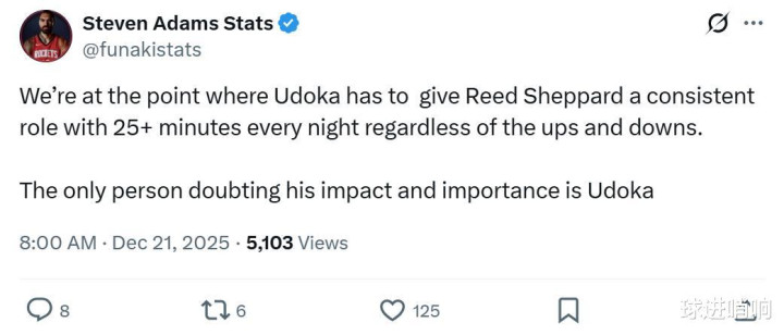火箭媒体人Steven Adams Stats也喊话乌度卡:“乌度卡必须给谢泼德一个稳定的角色,无论他当天的状态如何,他都必须出战至少25分钟,唯一质疑他作用和重要性的人,就是乌度卡自己。”