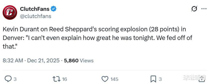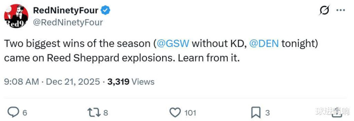 另外一位RedNinetyFour也晒出佐证:“本赛季火箭队最重要的两场胜利,在没有KD情况下击败勇士,以及本场复仇掘金,都是凭借谢泼德的爆发,乌度卡没理由不重用他。”
