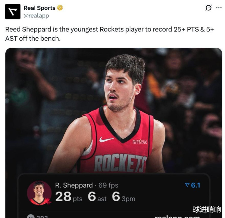 凭借这样的表现,21岁179天的谢泼德成为火箭队史以替补身份砍下至少25分5助攻最年轻的球员。