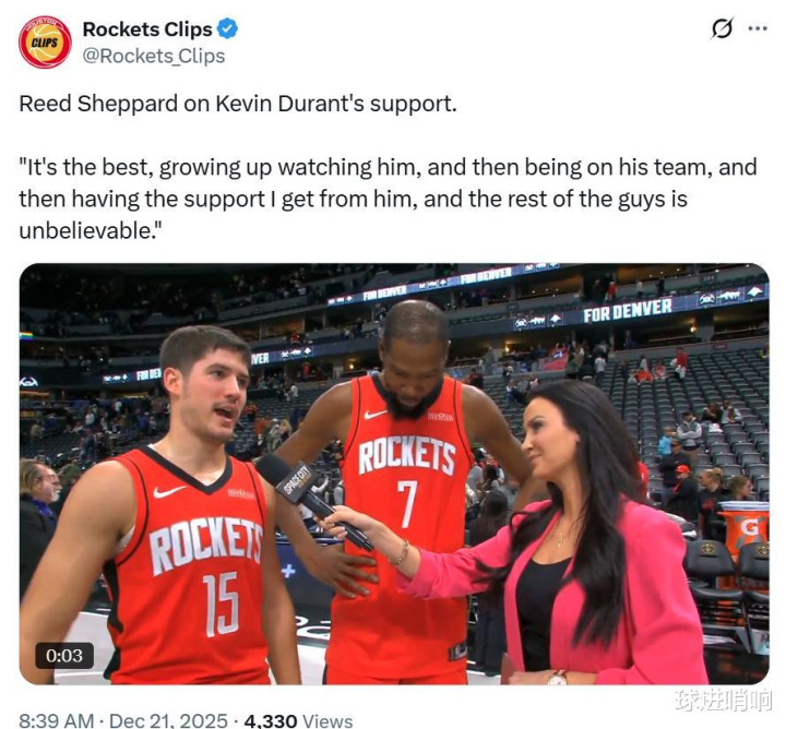 面对杜兰特的称赞,谢泼德将自己出色的表现归功于杜兰特的鼓励:“当像杜兰特这样的球员鼓励你果断出手时,你就是会打得更加从容。”